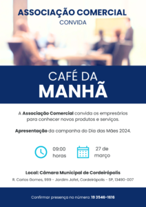 A Associação Comercial de Cordeirópolis (ACIAC)  em parceria com a Associação Comercial de Rio Claro (ACIRC) promove nesta quarta-feira (27) um café da manhã entre os comerciantes locais.