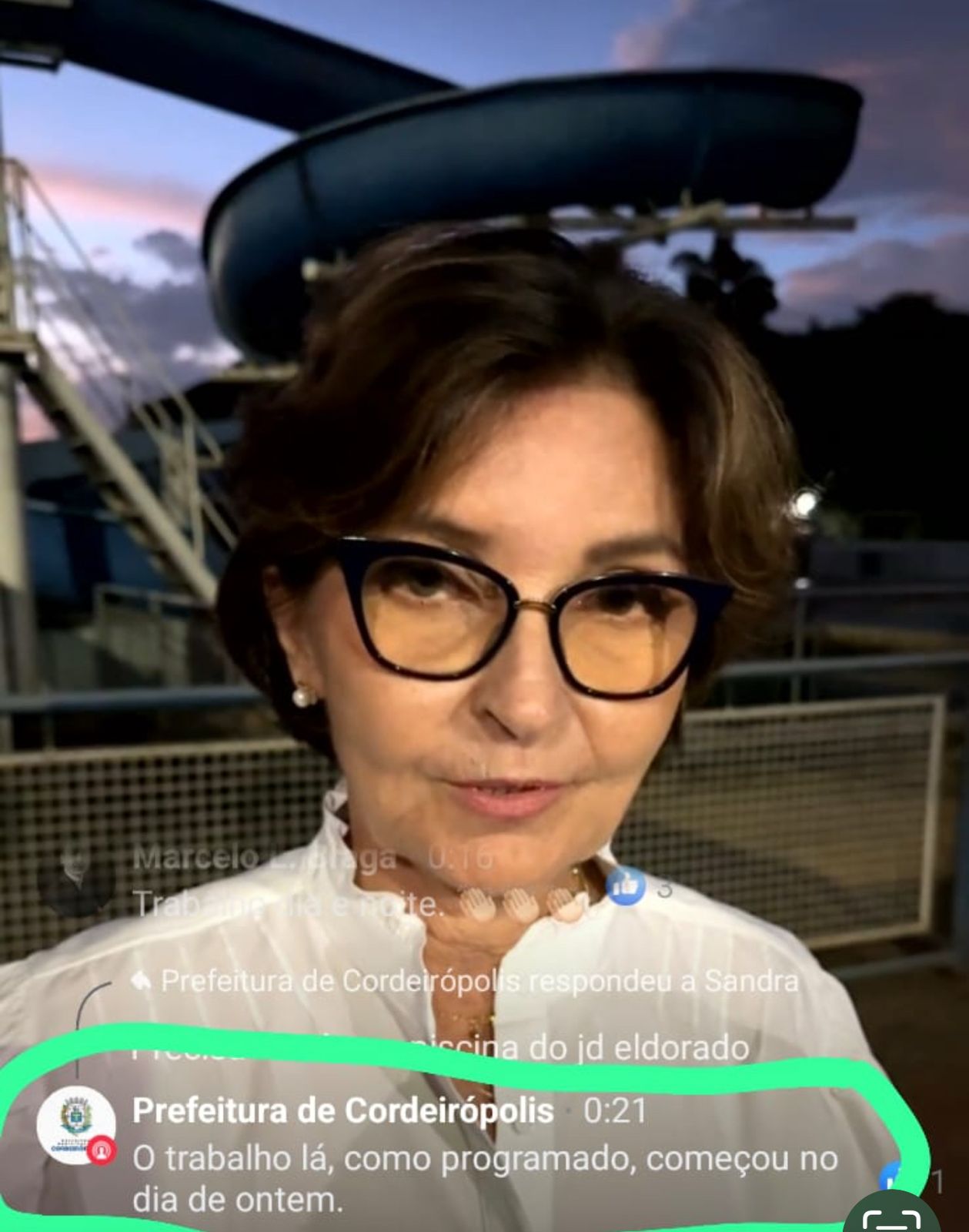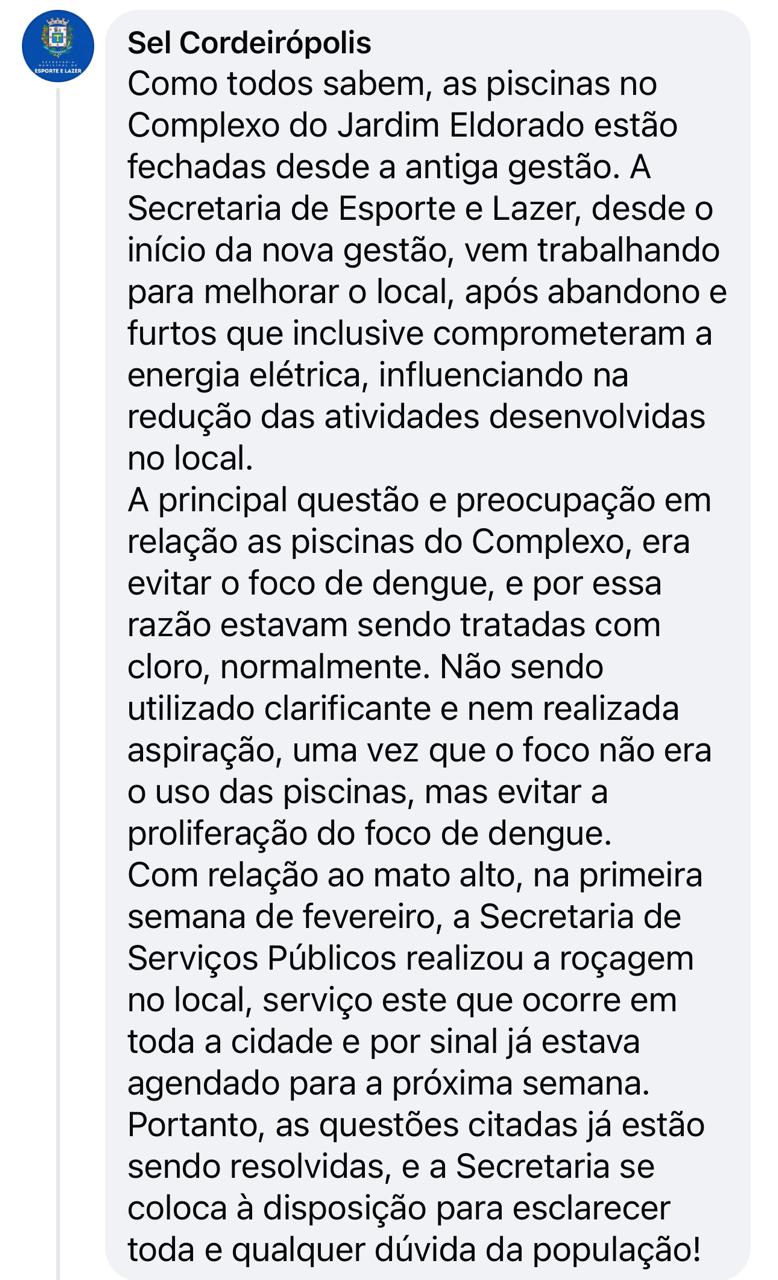 Já no Complexo Esportivo do Jardim Eldorado , a Secretaria de Esportes e Lazer se manifestou através de suas redes sociais na postagem do Martello News informando que a piscina não estava sendo utilizada devido ao furto de fios elétricos , o que comprometeu o funcionamento do local. Segundo a nota, a piscina vinha recebendo tratamento com cloro para evitar o risco da dengue, mas não passando pelo processo de aspiração e clarificação.