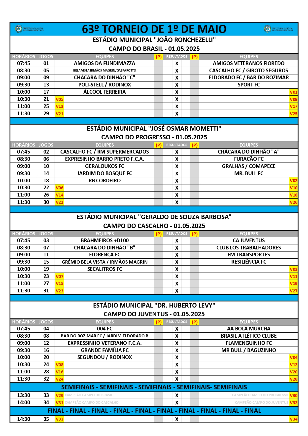 Cordeirópolis já vive o clima do tradicional Torneio 1º de Maio, que neste ano chega à sua 63ª edição reunindo 36 equipes em confrontos que movimentam os campos da cidade em celebração ao Dia do Trabalhador. A competição será realizada em um único dia, com jogos simultâneos a partir das 7h30 da manhã nos estádios do Cascalho (Geraldo de Souza Barbosa), Juventus (Dr. Humberto Levy) e Brasil (João Ronchezelli).