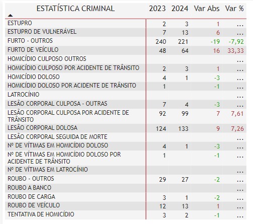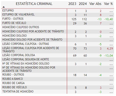 Outro destaque foi a queda nos casos de lesão corporal dolosa, que diminuiu 14,78%, passando de 115 para 98 ocorrências. O município também manteve estáveis índices como estupro e homicídio doloso por acidente de trânsito, demonstrando um trabalho eficiente de prevenção e controle.