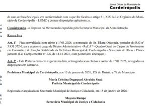 A portaria, datada de 15 de janeiro de 2026, nomeia Osvaldo Soares Trikara Okawada, para exercer o cargo de Diretor Administrativo, lotado na Secretaria Municipal de Obras e Planejamento.