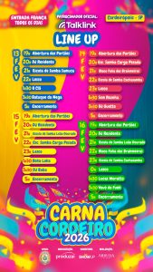 Cordeirópolis inicia nesta sexta-feira (13) a programação do Carna Cordeiro 2026, que segue até segunda-feira (16), com desfiles de escolas de samba e shows musicais na Avenida Presidente Vargas. Segundo a divulgação da Prefeitura, a abertura dos portões acontece diariamente às 19h, com entrada gratuita e controle de acesso nos pontos oficiais.